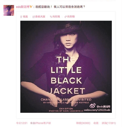 陳冠希昨天中午于微博轉貼湯唯海報,并稱:“我超喜歡她!有人可以幫我告訴她嗎?”大方示愛引起網友議論。有網友大贊他有有眼光,紛紛獻計獻策;但也有不少網友直呼:“放過她吧。”還建議湯唯要小心陳冠希的相機。