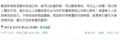 發博公布短信斥前妻顛倒黑白買紅妹剛以“真情”打動了大眾,將輿論天平扳向自己,孫楠也有動作了。昨日下午,孫楠發布一條微博,疑似回應買紅妹在節目中的言論及表現,“眼淚和謊言是最好的迷幻劑,她可以欲蓋彌彰,可以顛倒黑白,可以讓人成癮!所以有人屢試不爽。”孫楠還稱,音樂雖然也讓人成癮但是它會為你療傷,懂得寬恕。末尾時還更提出良好期望,稱希望大家能夠找到真實的自己,不被世俗的假面蒙蔽,寬容地對待周遭的污言穢語。這些似有所指的言論被認為孫楠是在指責買紅妹在節目中以眼淚和謊言顛倒是非,并希望她能找到真實的自己。不過,隨后就被刪除。