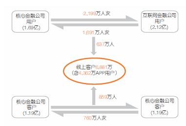 注:橫向遷徙指核心金融公司的互聯網服務平臺的用戶與互聯網金融公司的用戶間相互遷徙以及核心金融公司客戶間的相互遷徙。縱向遷徙指核心金融公司客戶向互聯網用戶的轉化以及互聯網用戶向核心金融公司客戶的轉化,詳細數據見公司業績報告。