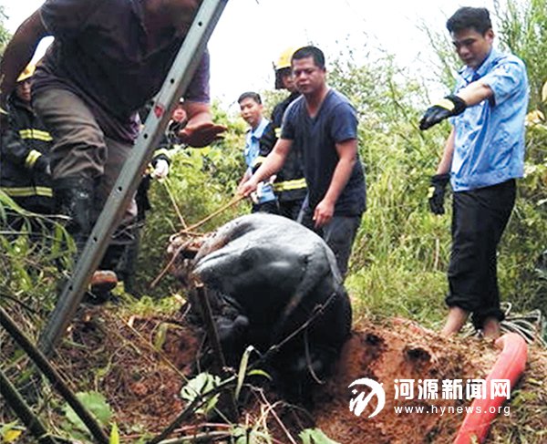 黃牛掉入深井,民警和消防官兵注水救牛。