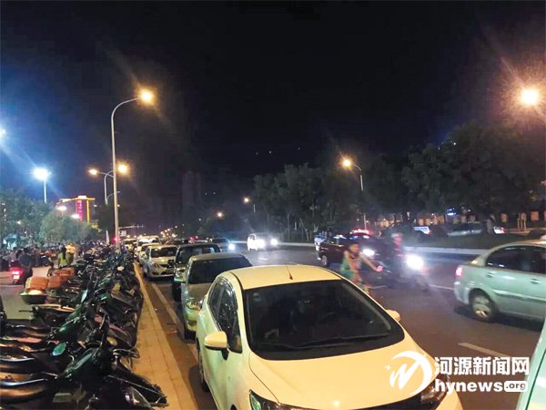 永和路客家文化公園路段,這里也是群眾反映違停較為嚴重的路段。前天晚上7 時許,記者沿著公園正門往兒童公園方向走,發現雖然在相隔500米左右的路段有兩個停車場,但一些車主還是圖方便,將車停在路邊。在這些路段,還有一些經營飲料、水果和玩具的商販,也將車停在路邊,行人只能走在靠近路中央的地方,綠燈一亮車流從行人身邊疾馳而過,十分危險。
