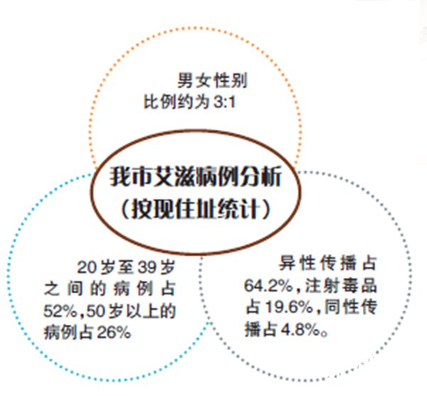 來自市疾控中心的數據顯示,目前 我市艾滋新發病例呈現上升趨勢,新報 告的病例中男女性別比例約為3:1,20 歲 至39 歲間人群占了一半余,老年人艾滋 疫情上升幅度最大,新報告病例數比 2013年翻了一番。