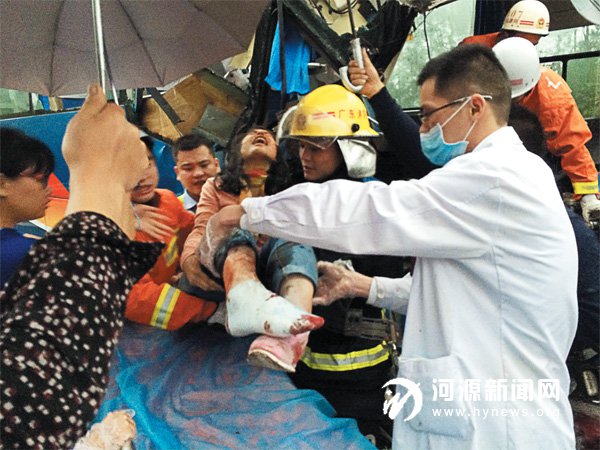 4 月10 日清晨5 時許,梅河高速往龍川方向柳城出口附近發(fā)生一起交通事故。一輛中型客車因大霧天行車,能見度較低與前面行駛的一輛貨車發(fā)生猛烈追尾,車身嚴重變形,駕駛室內(nèi)有兩人被困。龍川消防中隊接報后,立即趕赴現(xiàn)場展開救援,經(jīng)過大約 20 分鐘的緊張救援,成功地救出被困人員,并交由120 醫(yī)護人員救助。