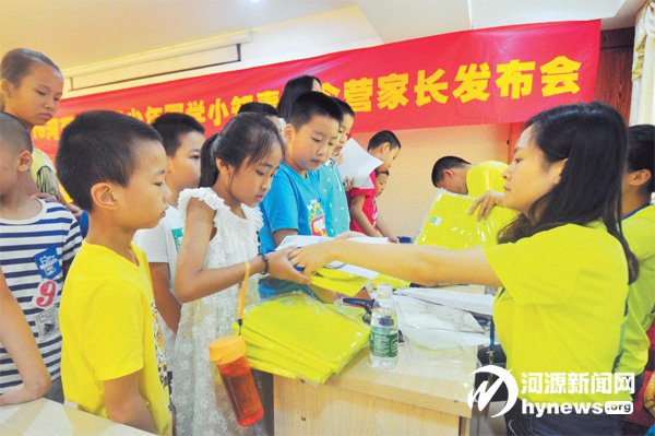 昨日上午,由本報主辦的“2016 年河源青少年國學小知青”夏令營活動舉行家長發布會,活動現場,工作人員向家長及孩子們告知活動事宜,為孩子們分發服裝等物品。今日上午,夏令營活動正式啟動,參加活動的小朋友們將在龍川知青部落、佗城鎮學習國學文化、體驗知青農耕生活等。