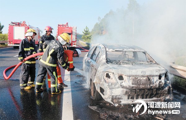 前日下午4 時58 分許,在河源往龍川方向G25 黃田3451 高速路段,一輛正在行駛中的小車突然自燃著火,整部輛車被燒得面目全非,最終在東源消防官兵的救援下將大火撲滅,所幸車內人員及時撤出車外,未造成人員傷亡。