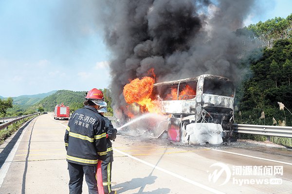 8 月6 日15 時左右,粵贛高速東源燈塔鎮龍祖山隧道附近,一輛行駛中的贛B 牌大客車突然發生自燃,所幸事故發現及時和車上乘客被快速疏散,未造成人員傷亡。接到火警后,東源消防官兵及時趕到現場進行撲火,當地交警立即啟動應急預案,河源北上江西方向的路段進行全面封閉,經過1 個多小時的奮力撲救,客車大火被撲滅,但由于火勢過猛,大客車最后燒成“骨架”。