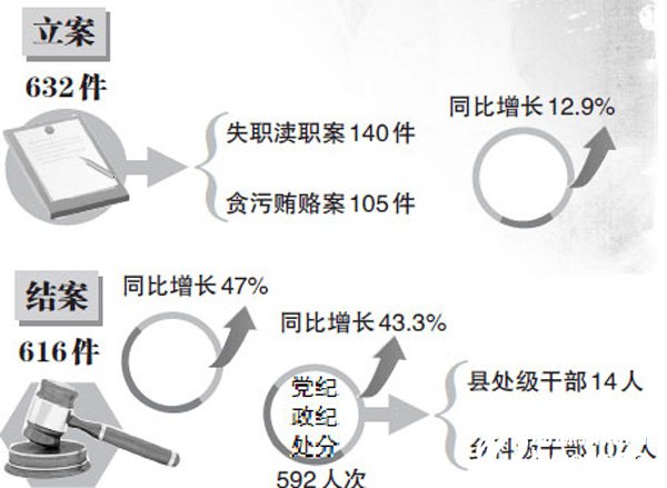 本報訊 記者 劉曦 在昨日召開的全市領導干部黨紀政紀法紀教育學習會上,市委常委、市紀委書記胡海廣通報了近一年來全市紀律審查工作情況。據悉,一年來,全市各級紀檢監察機關共立案 632 件,結案616 件,給予黨紀政紀處分592 人次,其中縣處級干部14人。