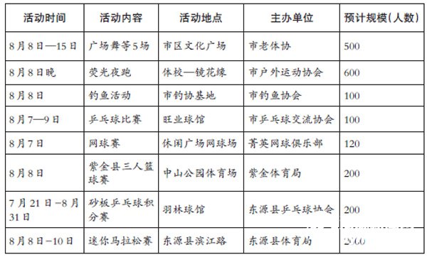據悉,今年市區的“全民健身日”活動基本都由各類體育協會自主主辦,市民可參與或欣賞到廣場舞比賽、熒光夜跑、釣魚比賽等活動。各縣區舉辦的體育活動更是五花八門,其中參與人數超過千人的有東源縣的迷你馬拉松賽、龍川縣的廣場舞大賽等。另外,連平縣還將從8 月8 日起,陸續組織1000 人開展國民體質測定活動。