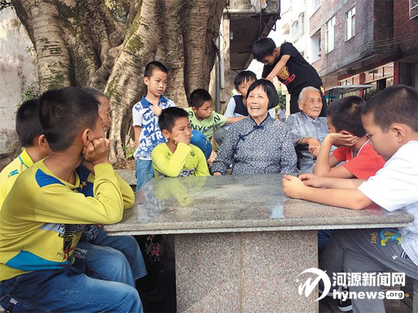 孩子們在古榕樹 下聽老人們講佗城百歲 街的故事。