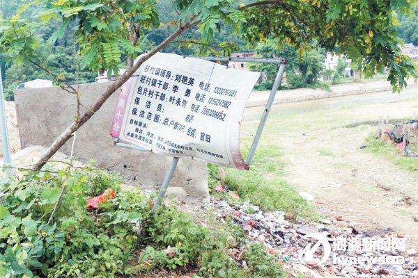 在垃圾堆上,記者還發現了一個傾斜的環境衛生保潔責任牌,上面有駐村鎮領導、駐村鎮干部、包片村干部的責任人名字及聯系電話,還有保潔員的名字及其聯系電話,還有保潔范圍以及目標要求,明確要求路邊、河邊、池邊,公共區域無積存垃圾,村莊無堆放垃圾,水面無漂浮垃圾,村道干凈,村容整潔。賴運區見狀,連忙丟下手中的活計兒,把牌子拔出來,重新豎在橋頭醒目位置。他邊豎邊說,但愿能把衛生保潔觀念“栽”進人們的心中。記者問附近一些路過的村民,看到有人丟棄垃圾時打過環境衛生保潔責任牌上面的電話沒有,村民說沒有打過電話,有些村民還說不知道有這個牌子。