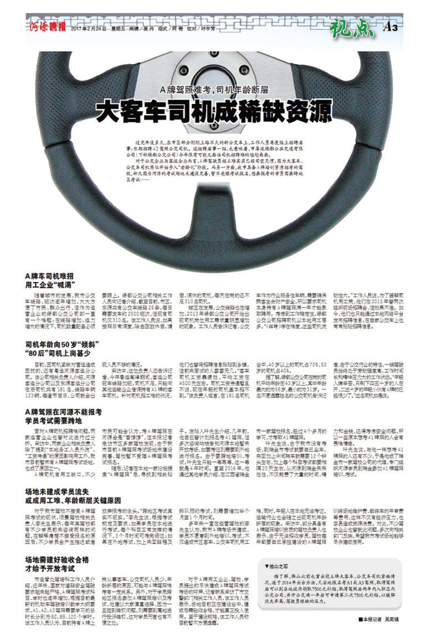 2 月24 日,本報(bào)《大客車司機(jī)成稀缺資源》報(bào)道刊發(fā)后,引起不少讀者熱議。許多讀者及報(bào)考A 牌駕照的學(xué)員認(rèn)為,我市考場(chǎng)未投入使用,A 牌駕照需要跨地區(qū)考試,對(duì)報(bào)考學(xué)員而言無疑是增加了難度。