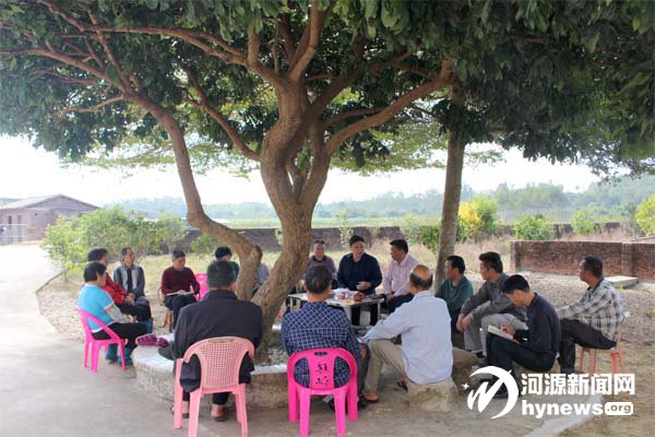 在源城區(qū)埔前鎮(zhèn)坪圍村泥徑村,埔前鎮(zhèn)委書記羅中正和大家圍成一圈,宣講十九大精神。