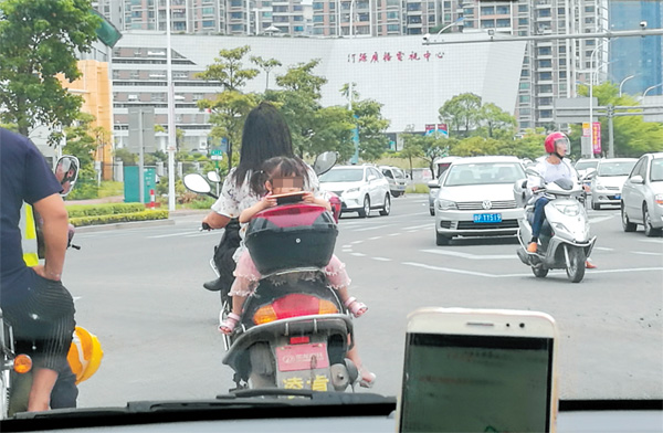 前日中午,一名小孩反向坐在摩托車上玩手機,讓不少路人為此捏了一把汗。記者看到,一名女子駕駛助力車從市區越王大道往永和路方向行駛,沒有帶安全頭盔,更讓人驚奇的是一名小孩還反向坐在摩托車上,神情專注地在玩手機,著實讓人感到吃驚。