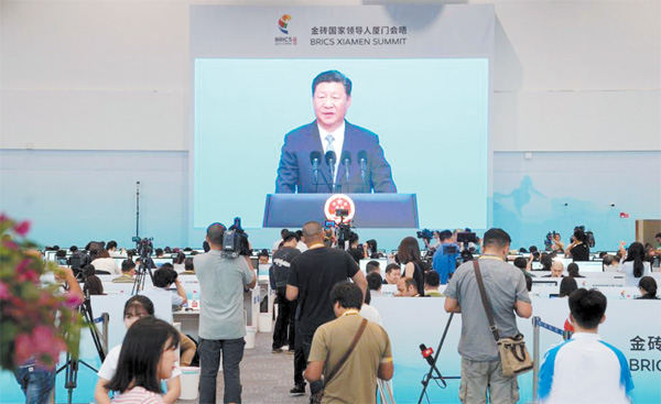 9 月3 日,位于廈門國際會展中心的金磚國家領導人會晤新聞中心工作大廳座無虛席。當天下午,金磚國家工商論壇開幕式在廈門國際會展中心舉行。國家主席習近平出席開幕式并發表主旨演講。圖為記者們專注正在直播的金磚國家工商論壇開幕式。