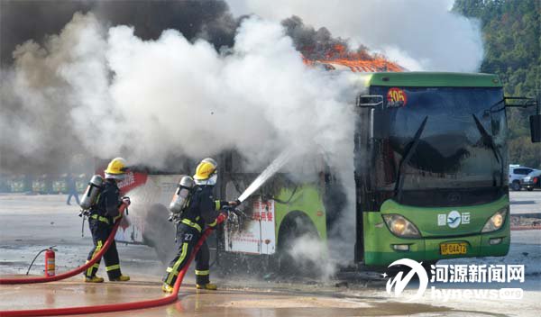 公交車車尾突然著火,司機(jī)立馬靠邊緊急疏散乘客并報(bào)警,隨后拿出滅火器噴火。很快,公交車火勢(shì)迅速蔓 延,車身玻璃已經(jīng)爆裂。此時(shí),消防官兵到達(dá)現(xiàn)場(chǎng),迅速撲滅明火。別緊張,這只是應(yīng)急演練。