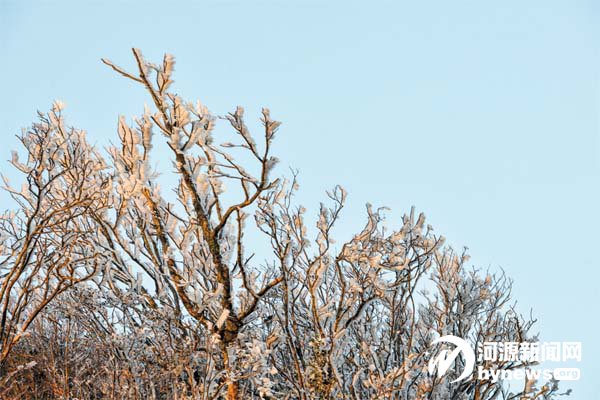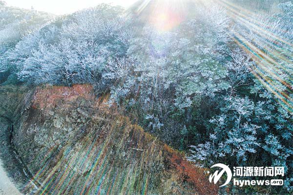昨日,受強(qiáng)冷空氣影響,我市多個(gè)地區(qū)迎來入 冬以來的第一場(chǎng)壯觀霧凇,在龍川、連平、東源等地 呈現(xiàn)銀裝素裹,樹上、小山坡上處處披上了銀裝,分 外妖嬈。昨日凌晨4 時(shí),本報(bào)記者從市區(qū)出發(fā),驅(qū)車 近兩個(gè)小時(shí)到達(dá)東源縣曾田缺牙山,天亮之前,山上 寒風(fēng)蕭瑟,山頂氣溫低至零下1 度,早晨6 時(shí)20 分左 右,初升的太陽慢慢解開了冰凍天氣下的山頂,這里 出現(xiàn)了霧凇美景,不少好奇的 市民和攝影愛好者紛紛前來觀 賞、拍攝,以此留照紀(jì)念。