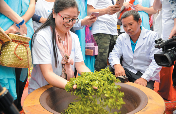 記者看到,丹仙湖首屆春茶開采節(jié)內(nèi)容豐富,形式多樣;顒蝇F(xiàn)場,草地上有茶藝展示,從選茗開始,到蓄水、置具、烹煮、聞香、品茗,茶藝師徐徐而動,令在場觀眾“品茗”的心思蠢蠢欲動;茶山上,采茶女唱著山歌,忙著采茶,大山里回蕩著歌聲笑聲?粗@如畫般的情景,有人忍不住拿出手機,記錄下這歡樂時刻。春茶開采節(jié)最精彩的環(huán)節(jié)莫過于體驗采茶,手挽竹籃,腳踩田埂上溫軟的泥土,盡情領(lǐng)略著這一路生態(tài)茶園風(fēng)景,感受著沁人心脾的茶葉芬芳。采茶并非易事,而炒茶制茶環(huán)節(jié)更是不易,在制茶專家的指導(dǎo)下,賓客動手將茶葉放入爐中進行炒、揉、捻、烘作業(yè),感受新穎真實的制茶樂趣。
