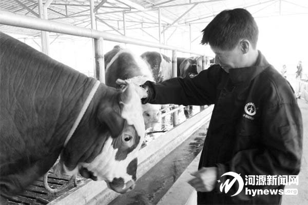 每天一吃過早飯,龍川縣老 隆鎮(zhèn)聯(lián)新村貧困戶曾得初就騎著 自行車,來到位于村白墩小組半 徑口的西門達(dá)爾肉牛養(yǎng)殖場照顧 他的“寶貝們”——150 頭西門達(dá) 爾肉牛,清潔、喂料,做得一絲不 茍。空閑時間,他還進(jìn)行牛體刷 拭,保持肉牛身體清潔。