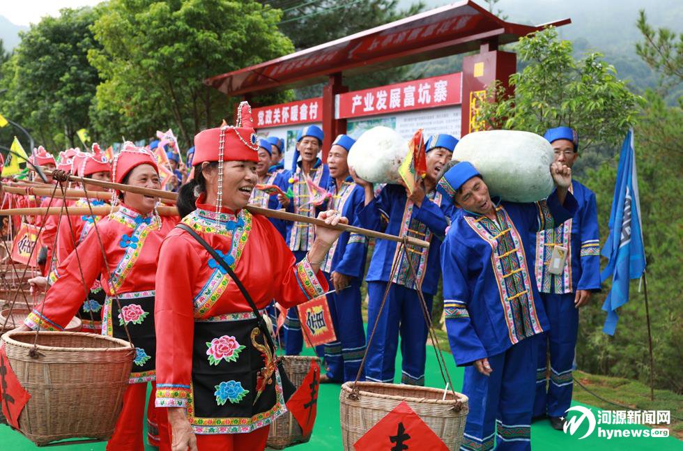 “歌聲起也山花開(kāi),歡迎你到村寨來(lái)哎!哎呀嗯哎哎,歡迎你到增坑來(lái)……朋友嘞...”早上9時(shí)左右,增坑村的村民早早就穿上了當(dāng)?shù)胤浅S忻褡逄厣姆棧伾锨嗵海衅痖L(zhǎng)隊(duì),在寨門(mén)前和著笑臉、唱著山歌,歡迎著遠(yuǎn)道而來(lái)的朋友。山歌唱完后,兩名畬族男青年推開(kāi)寨門(mén),本次豐收節(jié)正式拉開(kāi)序幕。