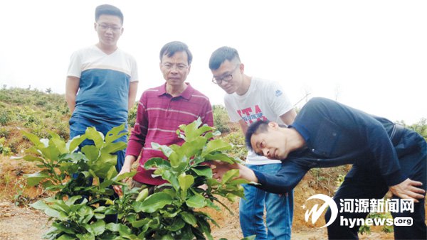 黃振球(左二)帶領駐村工作隊員深入蜜柚基地查看柚樹生長情況。