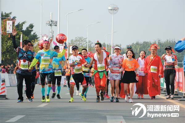 與專業(yè)選手相比,絕大部分個人參賽者都是來感受“河馬” 樂趣的,很多人穿著奇裝異服。有“孫悟空”“豬八戒”帶著幾個 兄弟來了,有“葫蘆娃”兄弟團,也有“超人”團集體沖刺半馬。