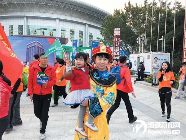 其中,身著古代皇帝龍袍的繆海橋帶著3 歲的“小公主”繆 愛楊顯得格外引人注目。繆海橋告訴記者,作為河源本地人, 他一直非常支持河源的體育事業(yè)。去年我市舉辦的馬拉松賽 事,他也帶著女兒參加了親子跑,體驗馬拉松的文化。今年在 參賽時為了顯眼,讓沒能參賽的孩子媽媽能第一眼看到他們, 繆海橋特地向本地服裝出租公司租了龍袍和公主服,“希望‘小 公主’這次能走完全程,不用我抱了。”繆海橋笑著說。