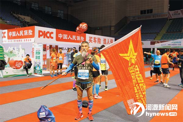 參加全馬昨日清晨6時許,天還未全亮,“河馬”選手們就陸續(xù)來到了 現(xiàn)場為賽事作準備。在市體育館內來來往往的人群中,有一名 頭發(fā)花白的老人家引起了大家的注意,只見他留著長長的白胡 須,高舉著紅色大旗,身上還貼著國旗和“中國老兵馬拉松俱樂 部”的標貼,選手們紛紛聚攏起來與他合影留念。據了解,這名 老兵名叫耿孝忠,來自東北黑龍江,今年已經68歲了,是前沈陽 軍區(qū)后勤部隊汽車團的一名退伍士兵。退休后的耿孝忠熱衷于 體育鍛煉,60歲時,他開始練習跑馬拉松。耿孝忠告訴記者,他 給自己定下了跑100 場馬拉松的目標,今年計劃跑35 場。他 10 月份從北京出發(fā),一路南下,參加全國各地舉辦的馬拉松賽 事,在到河源之前他已經連續(xù)跑了13場。“這是我第一次來河源 跑馬拉松,這地方真不錯,山好水好空氣好,人也熱情!”