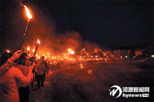 前日是大年十一,東源上莞鎮舉行傳統“追龍”鬧元宵活動。當晚六點,在上莞鎮新輪村陳公寨,“追龍” 正式開始,活動由舞龍舞獅開路,鑼鼓、鞭炮不絕于耳。全村男女老少都喜氣洋洋地手持火把依次跟隨游行, 隊伍沿著曲折蜿蜒的村道向鎮上進發,遠遠望去就像一條巨大的火龍在爬行,十分壯觀。與此同時,廣場上 的民俗節目也熱鬧開演。