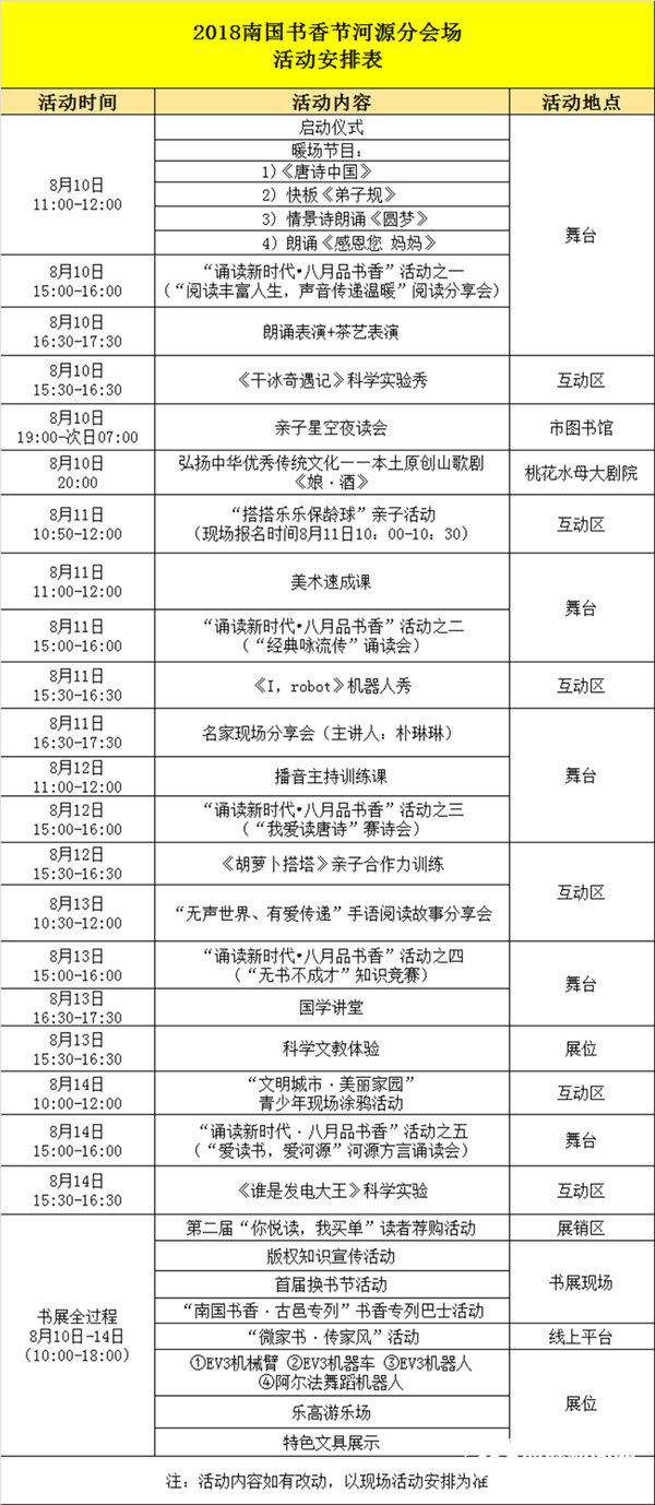 2018南國書香節河源分會場暨首屆河源書展,將于8月10日至14日在河源市堅基購物中心舉行。期間,市民不僅可以品讀、購買各類精品出版物,與河源非遺文化以及機器人、VR技術、朗讀亭等智能科技近距離接觸,還可以參與誦讀、涂鴉、換書、賽詩、科學文教體驗、科學實驗等豐富的活動。