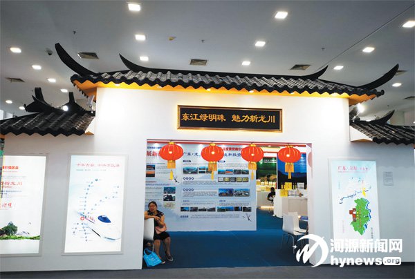 記者在現場看到,龍川展區以客家圍屋灰派建筑風格、歷史文化為主要元素,門上懸掛招牌,這些招牌呈現出龍川現代元素,諸如“東江綠明珠,魅力新龍川”“龍川無限商機,誠招天下客商”,內部招牌則有“中國光電顯示產業集聚地”“中國現代建筑生產基地”“中國空氣能產業基地”等字樣。