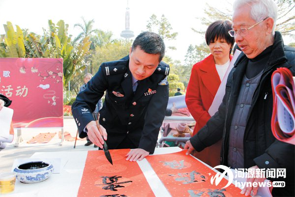 25日,河源公安文聯(lián)組織書(shū)法家到市區(qū)茶山公園開(kāi)展“闊步邁入新時(shí)代昂首奏出壯麗歌”新春寫(xiě)對(duì)聯(lián)祝;顒(dòng),現(xiàn)場(chǎng)為市民群眾免費(fèi)書(shū)寫(xiě)對(duì)聯(lián),送上節(jié)日祝福。