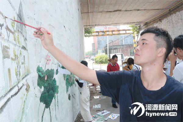 19日,源城區源南鎮雙下村主村道鐵路橋橋洞下,14名中山大學的師生正頂著烈日對橋洞進行墻繪,筆下的荷葉千姿百態,栩栩如生,受到了當地村民的嘖嘖稱贊。