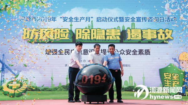 昨日下午3時,河源市2019年“安全生產月”啟動儀式暨安全宣傳咨詢日活動在舞蹈《應急救援之歌》中拉開序幕;顒佑珊釉词邪踩a委員會主辦,河源市安全生產委員會辦公室、河源市應急管理局、河源晚報社聯合承辦。市委常委、常務副市長黎意勇,市政府副秘書長鄺偉毅,河源市安全生產委員會辦公室主任、河源市應急管理局黨組書記、局長賴昌彬以及河源市安全生產委員會各成員單位的分管領導和有關負責人出席了啟動儀式。黎意勇、鄺偉毅、賴昌彬一同開啟啟動球,宣布河源市2019年“安全生產月”活動正式開始!