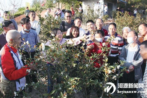 近日,記者來到和平縣合水鎮油茶種植基地,看到上百畝連片油茶花競相綻放,格外喜人。油茶林里,一些村民在進行茶園管理,或鋤草,或摘果。河源市油茶行業協會會長、東江綠生物科技有限公司負責人張金輝也來到油茶林間,宣講黨的十九屆五中全會精神,為茶農鼓勁加油。