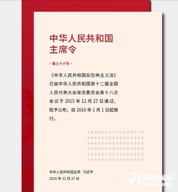 第九十七條 本法自2016年1月1日起施行。2011年10月29日第十一屆全國(guó)人民代表大會(huì)常務(wù)委員會(huì)第二十三次會(huì)議通過(guò)的《全國(guó)人民代表大會(huì)常務(wù)委員會(huì)關(guān)于加強(qiáng)反恐怖工作有關(guān)問(wèn)題的決定》同時(shí)廢止。