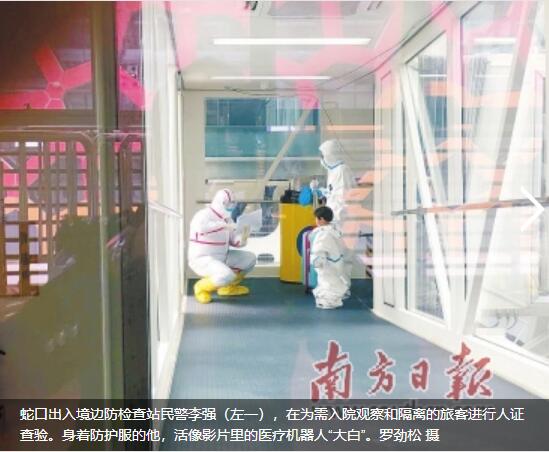 高大、微胖,一身厚厚的白色防護(hù)服,活像是影片里的醫(yī)療機(jī)器人“大白”。1月26日(大年初二),在郵輪“歌詩達(dá)·威尼斯號(hào)”上,蛇口出入境邊防檢查站民警李強(qiáng)身著防護(hù)服,為需入院觀察和隔離的旅客進(jìn)行人證查驗(yàn)。