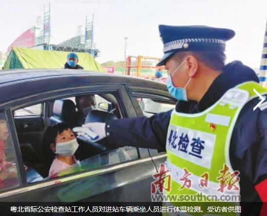 粵北省際公安檢查站站長李劍對(duì)進(jìn)站車輛乘坐人員進(jìn)行體溫檢測,提醒司乘人員注意衛(wèi)生安全。