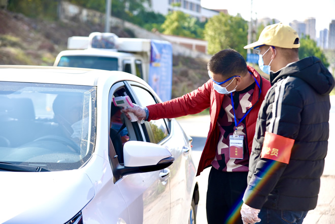 東方紅村七天酒店路口交通流量最大的疫情防控監測點,這里需要全天24小時值班值守,對進入轄區的車輛進行登記,并對相關過往人員進行全覆蓋體溫測量。“值夜班的幾個年輕人,都是志愿者,他們一值就一個星期。”東方紅村黨支部何書記介紹,村民在村黨支部的帶領和引導下,村民自發在每個巷口拉起了“紅色警戒帶”,設置“為了您和親人的健康,請您返回!”等內容的溫馨提示牌,每個巷口都是一個“無人檢疫點”。