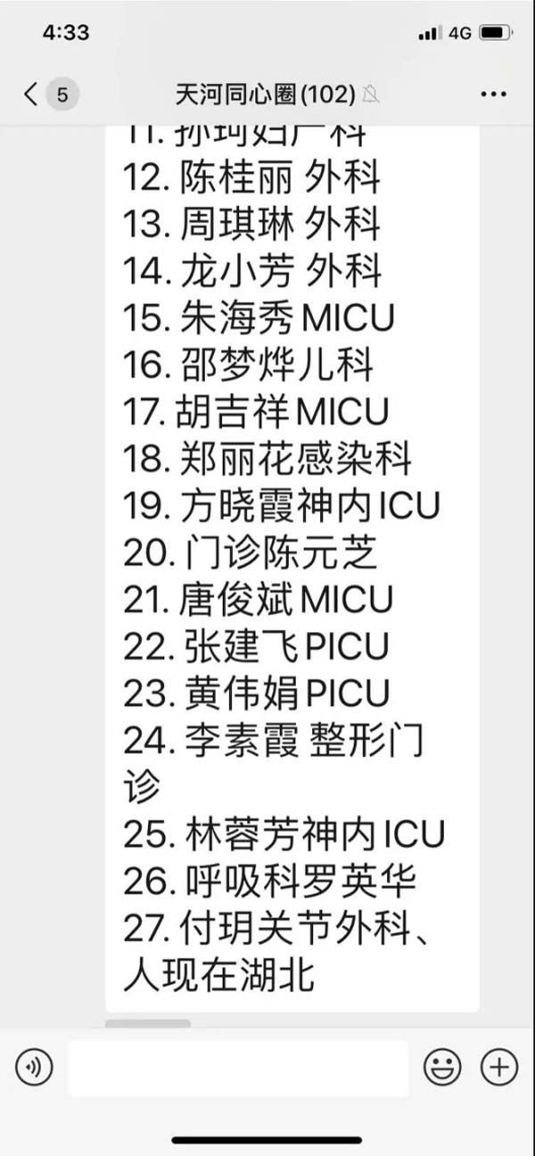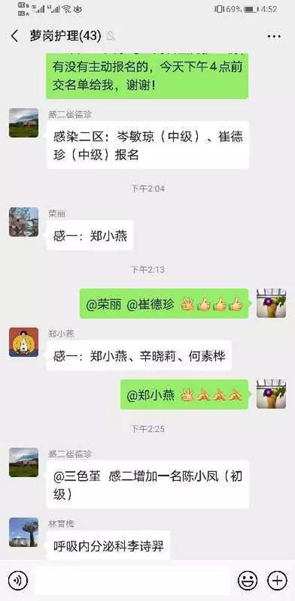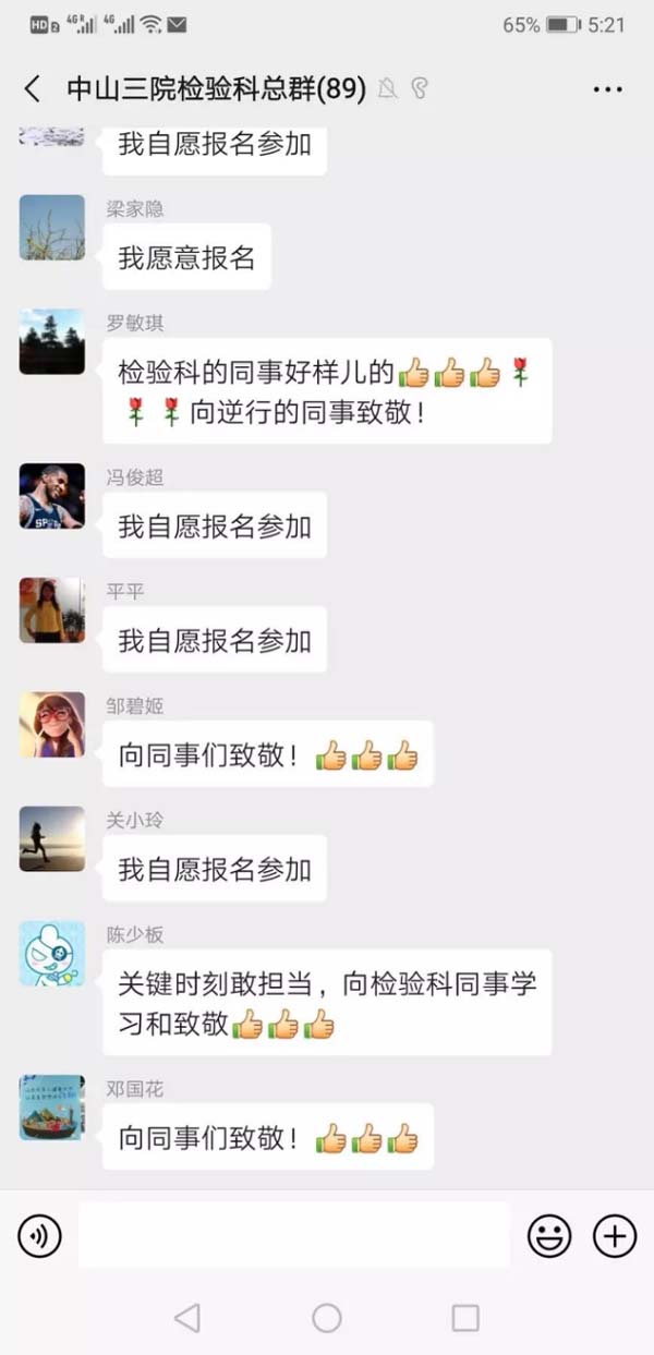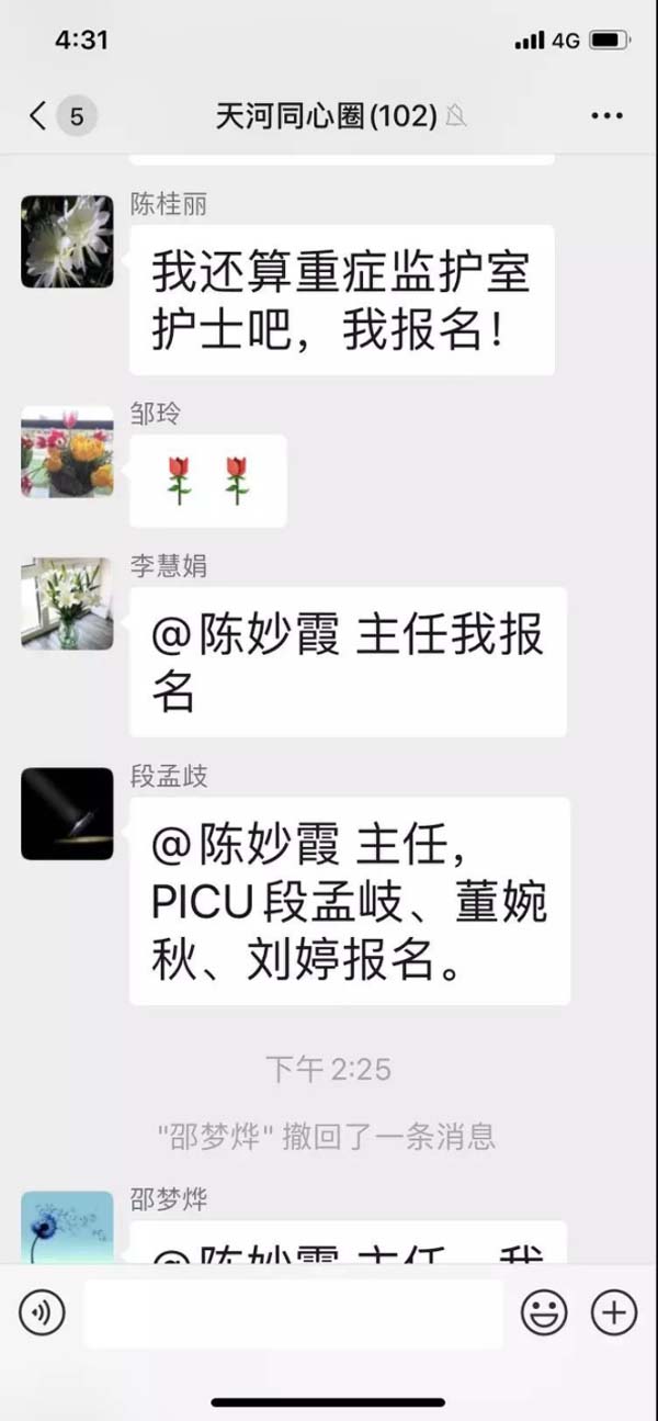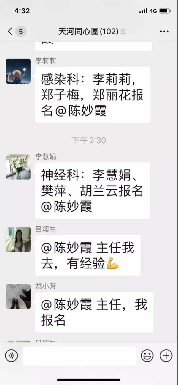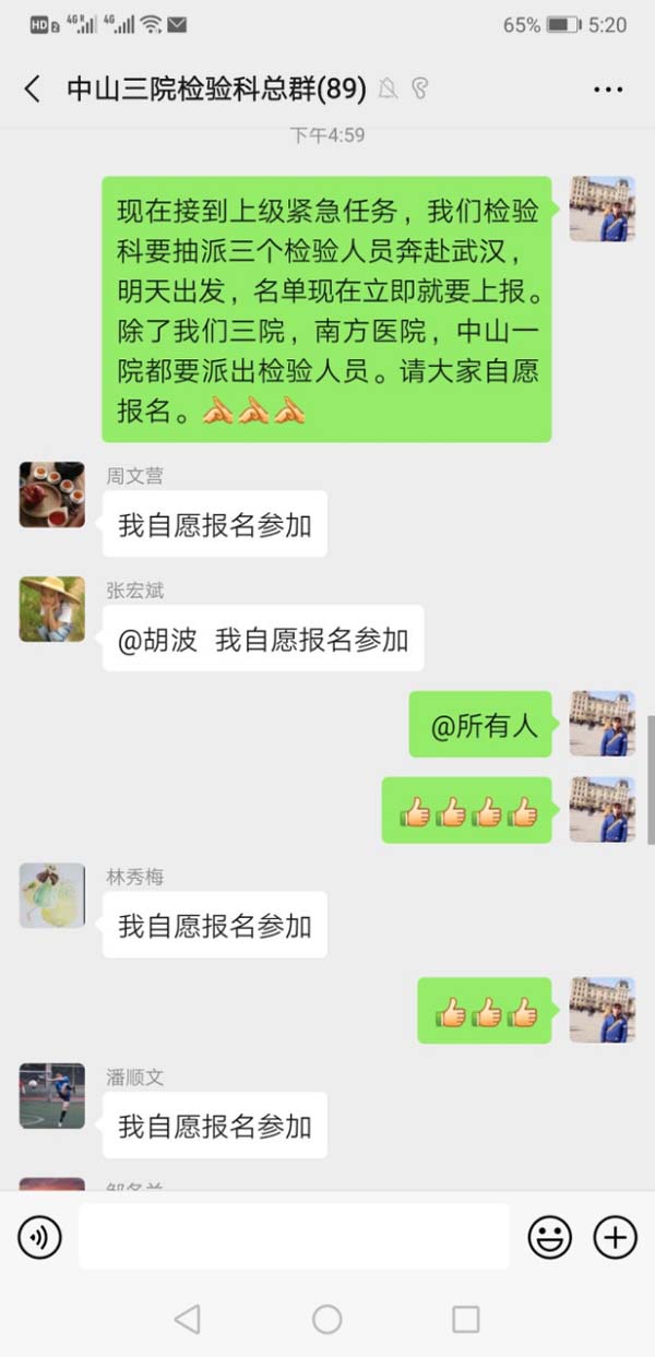 收到組織的號召,報名群里炸開了。醫院各相關科室負責人在群里發出通知,不到半個小時候的時間,報名人數爆滿,遠超需要數量。急需的呼吸科、檢驗科專家們踴躍請戰,整裝以待馳援武漢的號角。