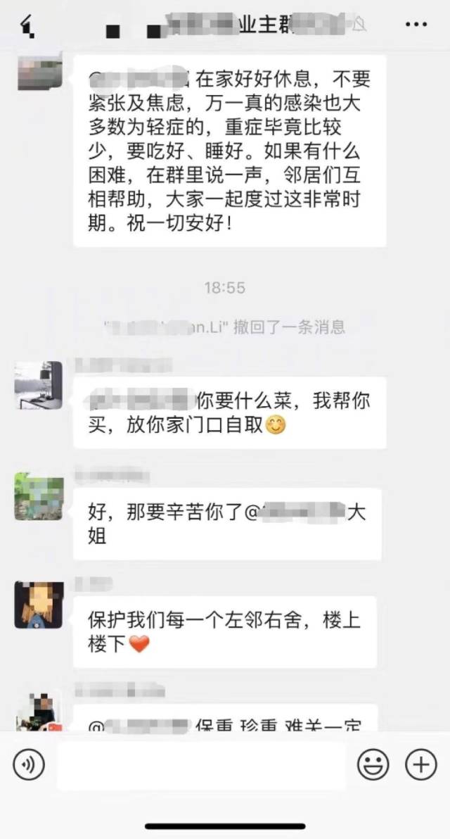“保重,珍重,難關一定能過去。”“一切會好起來的,加油。大部分人都很容易康復的,這就是厲害一點的流感……”“災難當前,相互支持幫助,才是我們的最佳選擇。”鄰居們紛紛在微信群里面安慰陽先生一家。