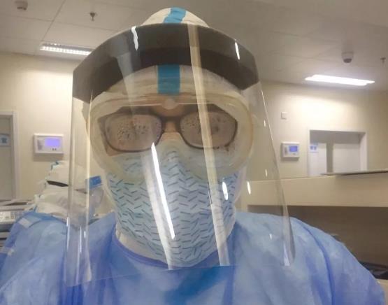 在醫院,護目鏡和N95口罩必須佩戴嚴實,時間一久會有缺氧的感覺,頭部脹痛得厲害。額部和鼻梁處在擠壓下,人人都成了“壓瘡臉”。