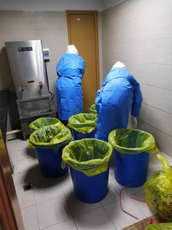 同時,為了避免清潔阿姨進來收撿垃圾時被感染或不小心弄亂劃分區域,我們在門口溫馨提示“垃圾我們自行清出”。
