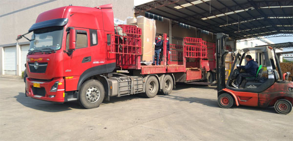 經過落實相關入廠的防疫措施后,峰德機械公司工作人員將打包好的醫用電動病床進行裝車交貨,預計今天下午能裝載完畢,確保以最快速度將馳援物資送達“疫”線。
