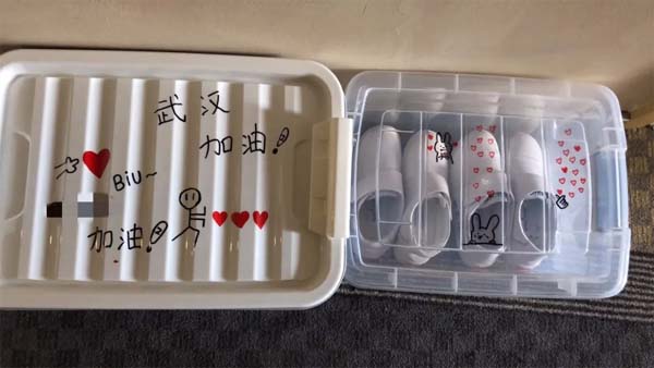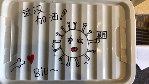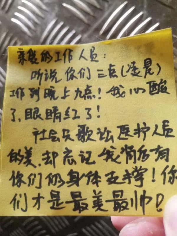 為了防護(hù),雙方不能直接交流,他們就在微信群和便利貼上表達(dá)了謝意,在鞋盒上畫下鄭重的守護(hù)。