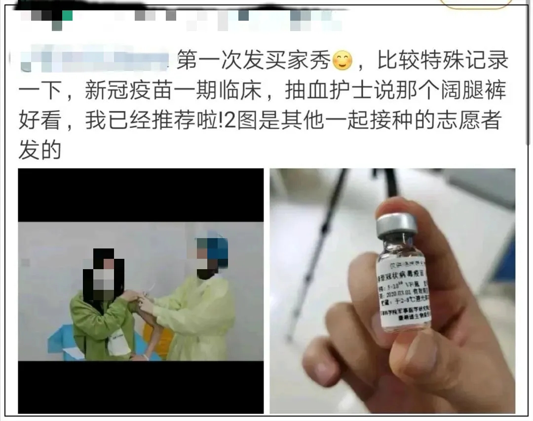 此前,這位姑娘在微博發了條買家秀,夸贊了店主的褲子,還順便提了一句,她穿著那條褲子,作為志愿者,接種了新冠疫苗。