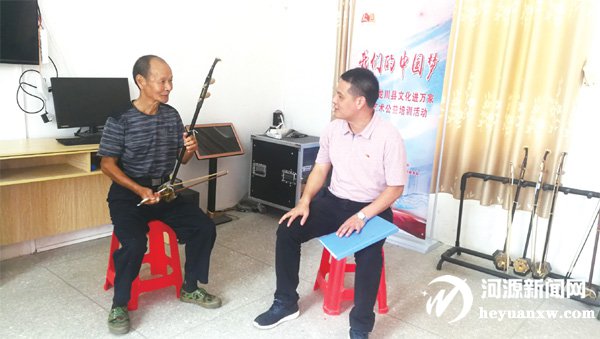 葉青(圖右)向二胡愛好者黃居常了解文化需求情況。