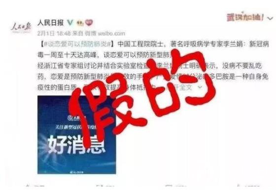 有人造謠:“李蘭娟院士說談戀愛可以預防新型冠狀病毒感染的肺炎”,后被澄清系網友P圖惡搞。