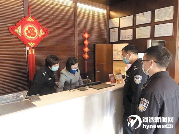廖瑾(左一)在旅業檢查入住人員登記信息。