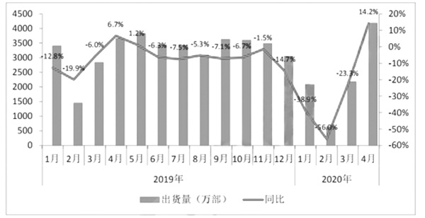 受新冠肺炎疫情影響,國內手機市場在2020年第一季度呈現低迷。在國內疫情逐步得到控制后,多數企業紛紛復工復產,零部件和手機組裝逐漸恢復。在此利好背景下,2020年4月,國內手機市場總體出貨量達到4172.8萬部,同比增長14.2%,但因為第一季度銷售不佳,2020年1-4月國內手機市場總體出貨量累計9068.1萬部,同比下降20.1%。