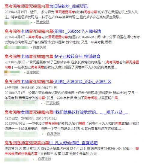 記者搜索發現,有多家媒體曾對此文辟謠。在2012年,中國青年報曾辟謠,“高考閱卷師冒死揭露內幕”系舊謠新炒。當時,還有網友在這篇不實文章的開頭加了地名,標題被改為“北京高考閱卷師冒死揭露內幕:學生的前途就這樣被耽誤”。新聞晚報在2013年的一篇報道中也提到,早在2007年、2008年左右,這篇網文就在網上熱轉過,有網友提到文章里面的“每天50-70袋試卷”的情況,不是2013年前后的閱卷場景。